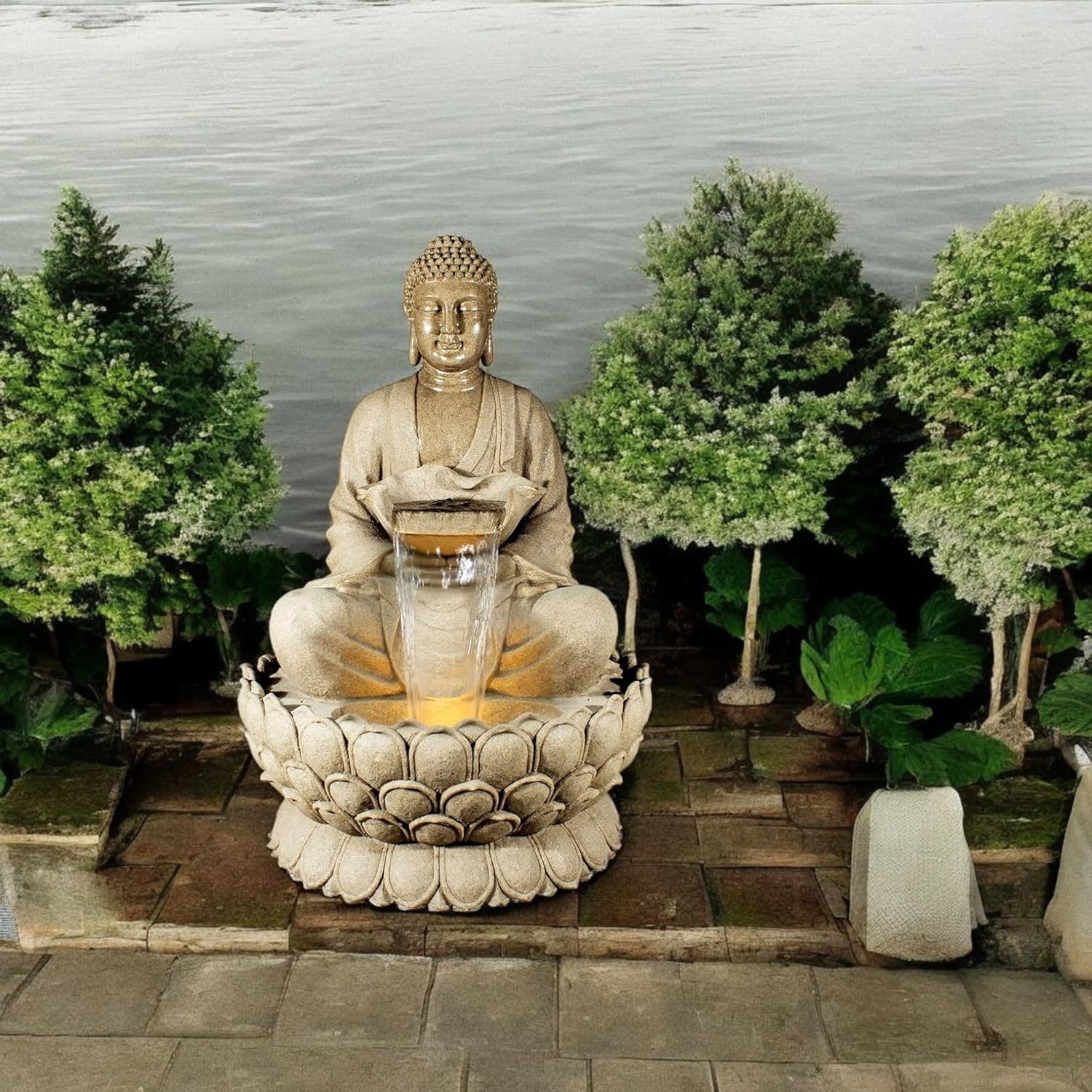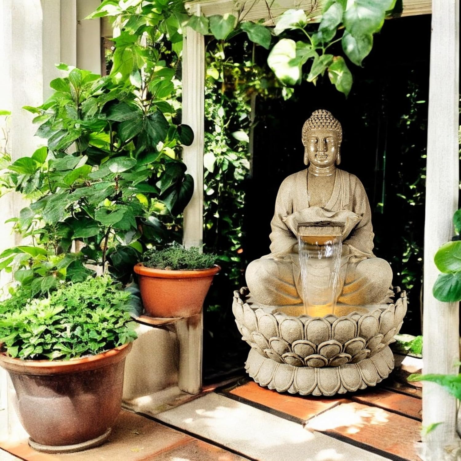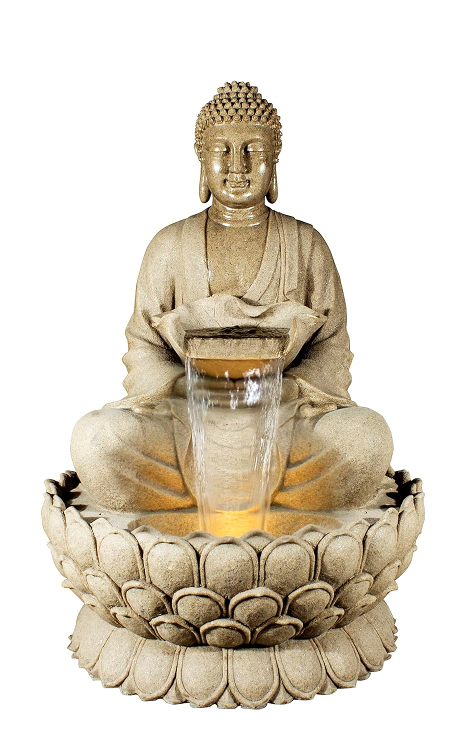 Holiness Craft Big 4.6 feet Mystic Large Lotus Buddha Fiber Water Fountain for Home Decor, Living Room, Garden-Yard Art, Decoration Gift Gifting, and Door Entrance (Black), Create a soothing ambiance in your home with the Holiness Craft Fountain. The soothing sounds of a cascading water stream flowing down each tier and the warm glow of the LED light create a tranquil mood in your space, ideal for meditation or a romantic dinner. Thanks to the weathered pillars that resemble natural stone and real river rocks, this fountain features a rustic character that adds a touch of natural charm to your decor. This fountain Size is perfect for your office, bedroom, living room, hall, kitchen, and more.